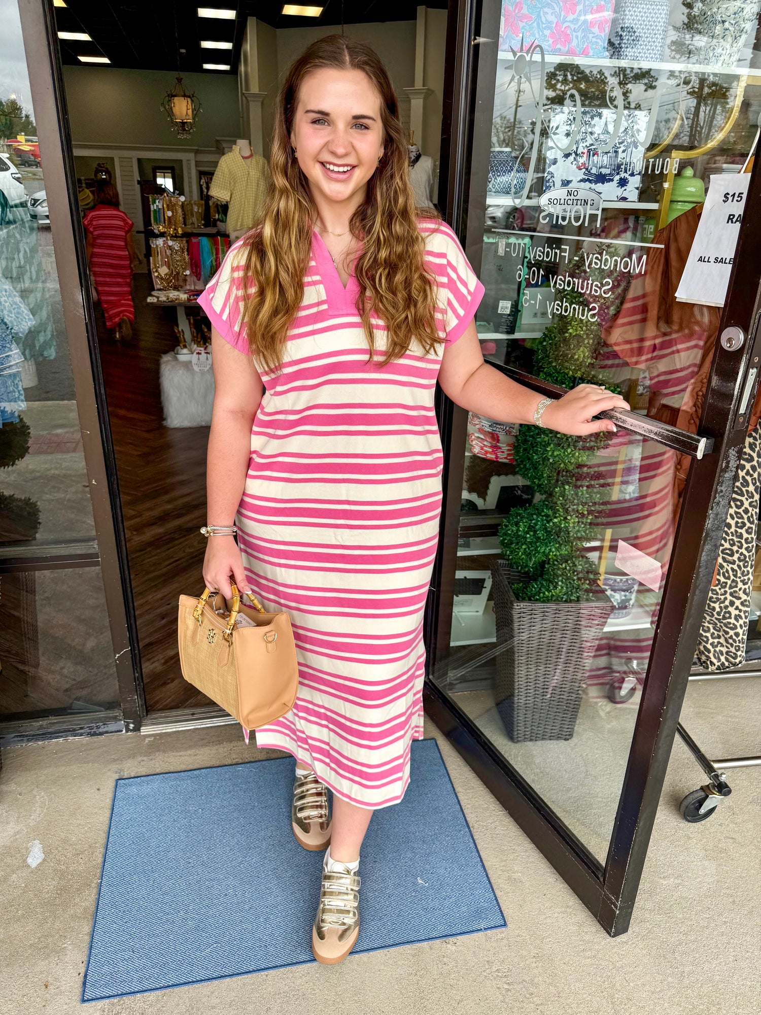 Chason Pocket Stripe Midi Dress: Pink
