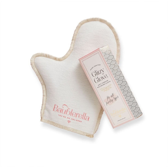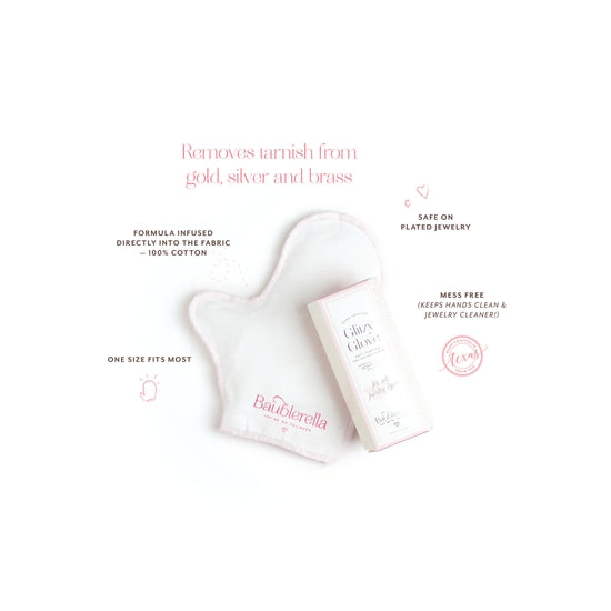 The Glitzy Glove is a hand-crafted jewelry polishing mitt that removes tarnish from silver, gold and brass metals. When using the Glitzy Glove, you will be able to see the tarnish go straight from your jewelry to the cloth. Contains one mitt.
