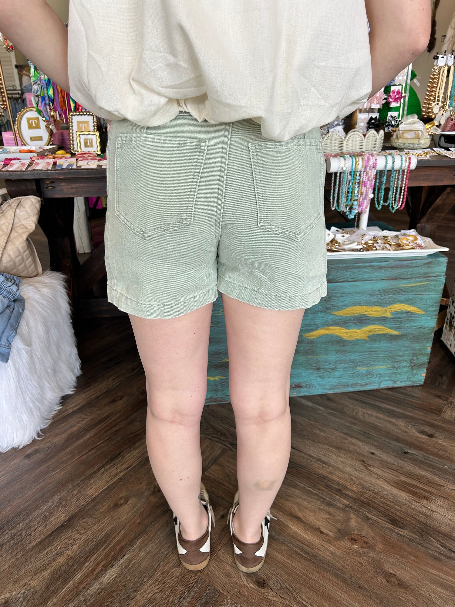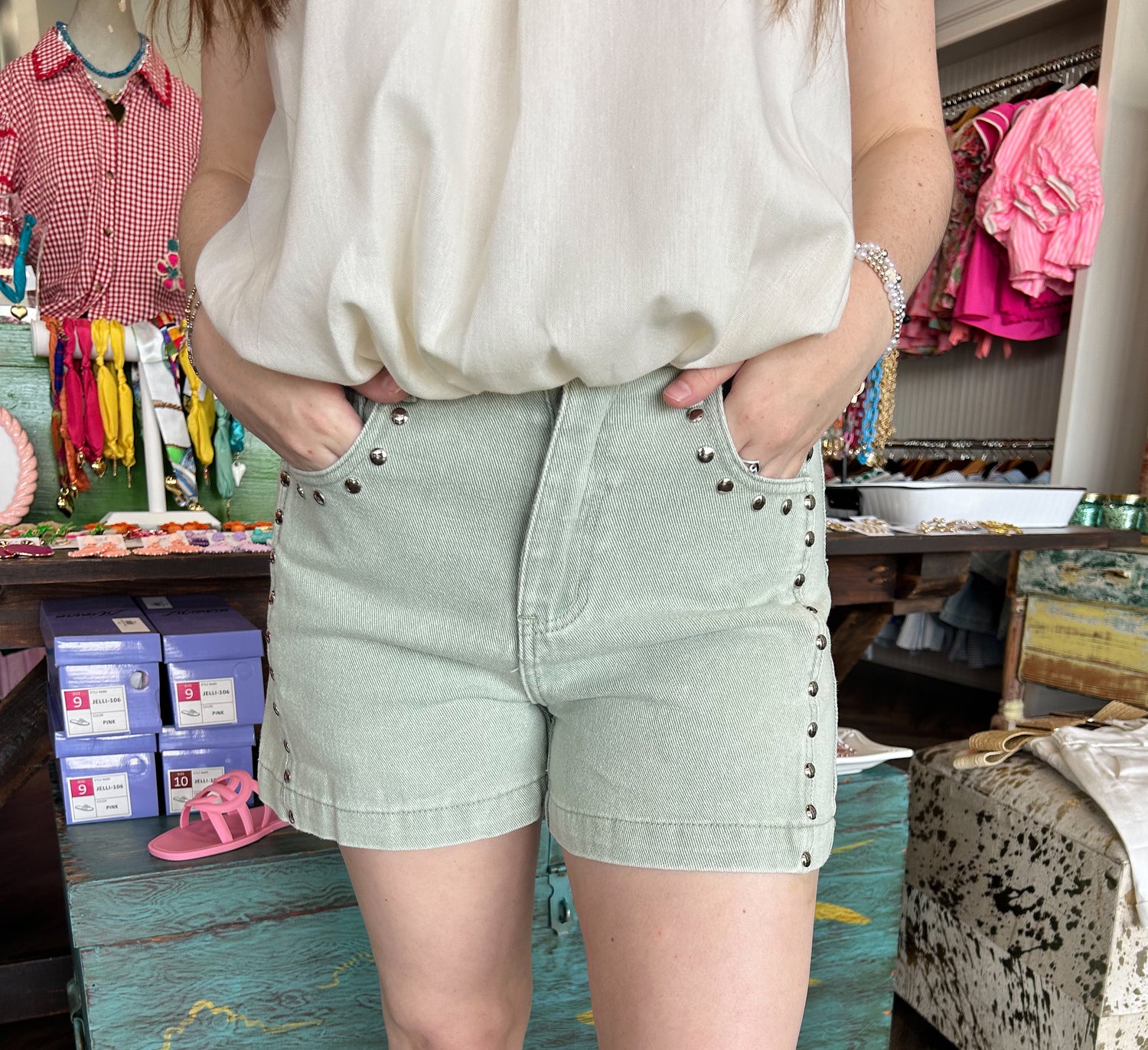 Studded Denim Shorts: Seafoam
